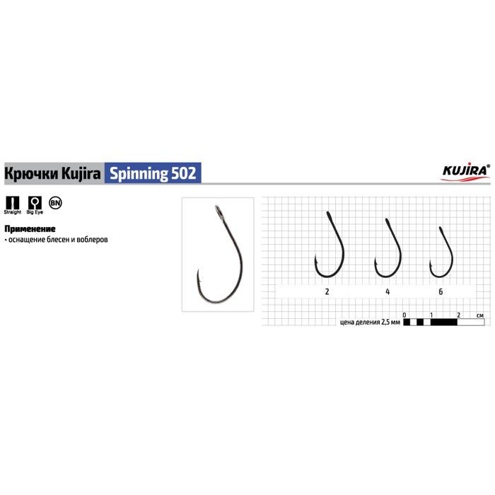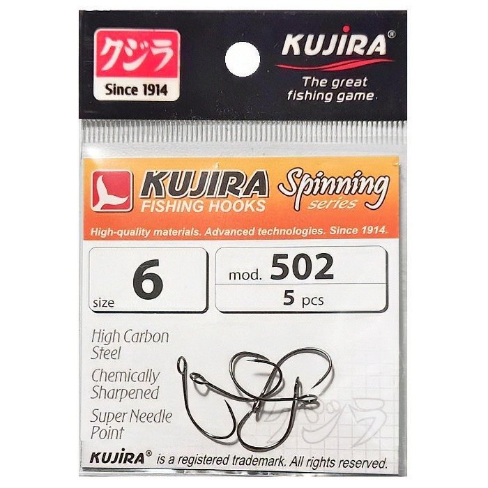 Крючки Kujira Spinning серия 502 Bn - кованые одинарные рыболовные спиннинговые крючки с увеличенным диаметром ушка предназначен для оснащения воблеров, колебалок и силиконовых приманок. Крючками Kujira Spinning серия 502 Bn оснащаются форелевые колеблющаяся блесны Akara Trout Time Namida и подходят как запасные крючки для многих микроколебалок. Главное отличие Kujira Spinning серия 502 Bn заключается в большом диаметре ушка, что позволяет соединить крючок с приманкой при помощи заводного кольца, внутренний диаметр ушка крючка №6 составляет 2,2 мм. Так же данная серия часто применяется для скользящей оснастки. При обзоре характеристик и тестов, одинарные крючки для воблеров Kujira Spinning серия 502 Bn получили положительные отзывы и рейтинги экспертов по рыбной ловли. Продаются упаковками по 5 штук в цвете BN, цена указана за упаковку.