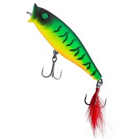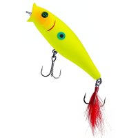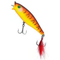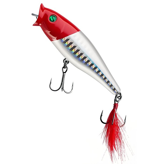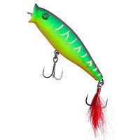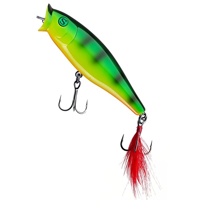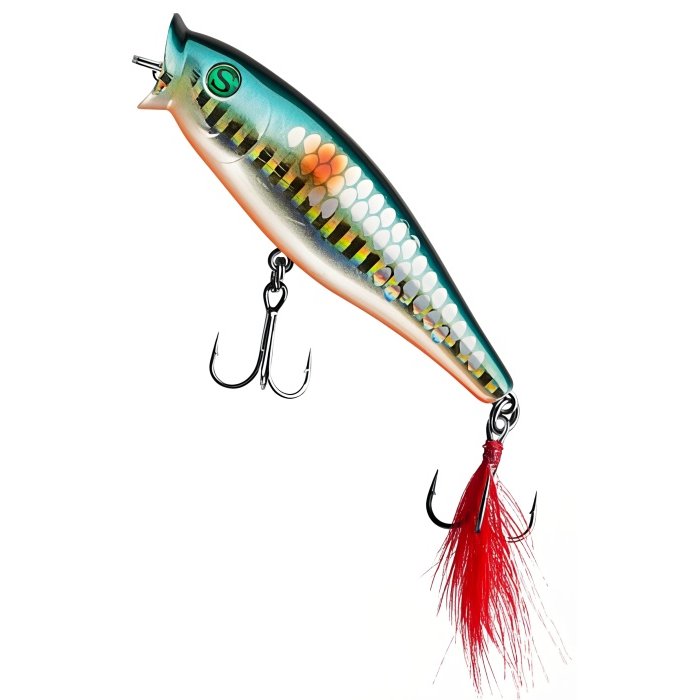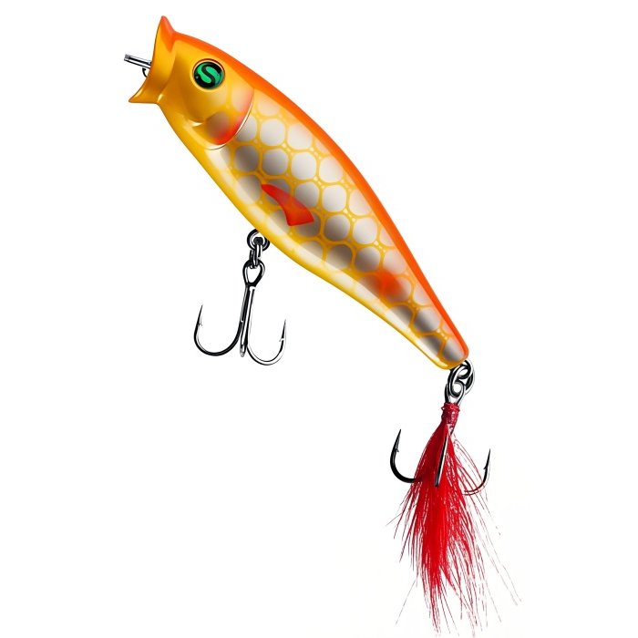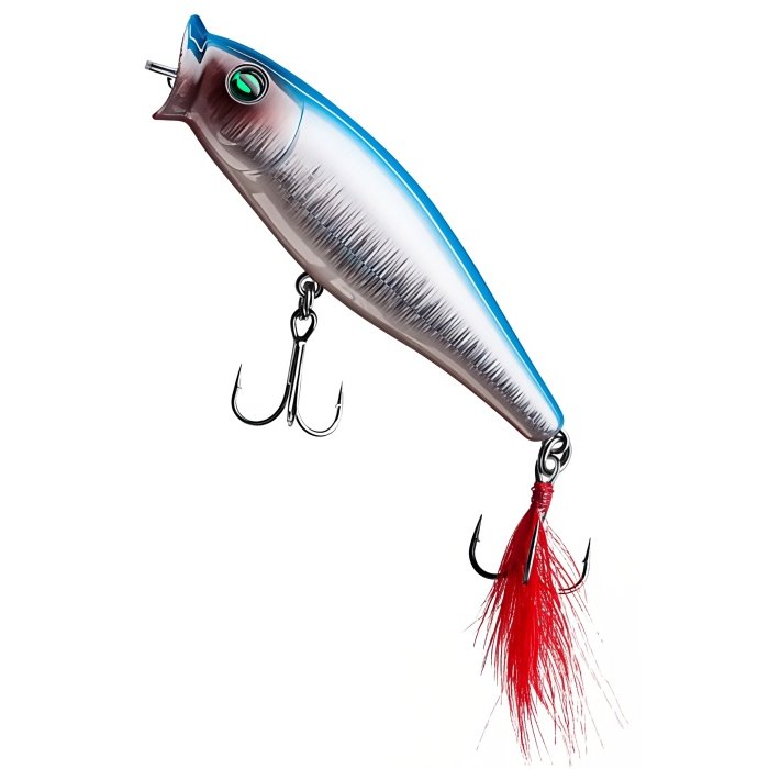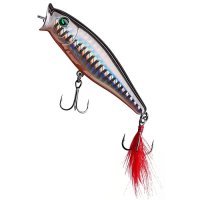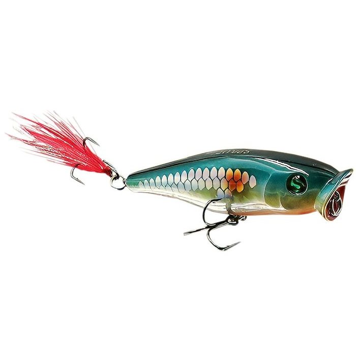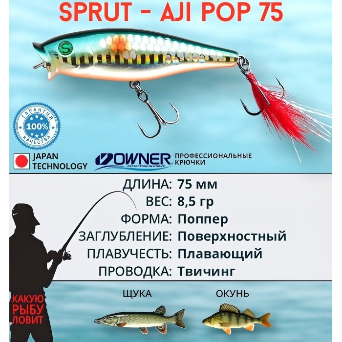 Воблер Sprut Aji Pop 75TW - представитель семейства попперов с оперением, от компании "Спрут". Поппер имеет классическую форму, которая позволяет выполнять дальние и точные забросы. Благодаря глубокой выемке в передней части Aji Pop создает громкие звуки и при рывковой проводке и активно разбрызгивает воду перед собой. Также оставляет характерный след на поверхности. В сумме эти факторы являются отличными раздражителями практически для любой хищной рыбы, в первую очередь для щуки и окуня. Воблер оснащен японскими, тройными крючками торговой марки OWNER. При обзоре характеристик и тестов, поверхностный воблер Sprut Aji Pop 75TW получил положительные отзывы и рейтинги экспертов по рыбной ловли. Поппер Sprut Aji Pop 75TW в первую очередь предназначен для облова мелководных, заросших участков водоемов любых типов в летнее и осеннее время.