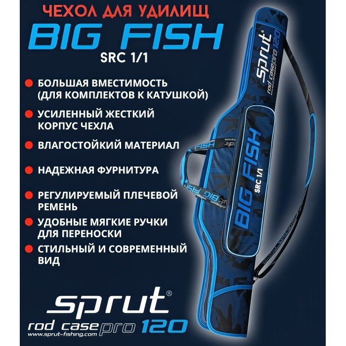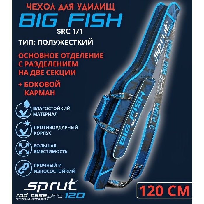 Чехол Sprut Rod Case Pro 120 Big Fish (SRC 1/1) - чехол для удилищ с катушками Sprut "Big Fish" -SRC 1/1 представляет собой полужесткую модель, которая обеспечивает надежную защиту ваших рыболовных удилищ. Основное отделение разделено на две секции, что позволяет удобно разместить различные типы удилищ. Кроме того, имеется боковой карман для хранения дополнительных аксессуаров. Чехол изготовлен из влагостойкого материала, что защищает содержимое от воды и неблагоприятных погодных условий. Фурнитура отличается высокой надежностью, что гарантирует долговечность изделия. Регулируемый плечевой ремень позволяет удобно носить чехол, а мягкие ручки обеспечивают комфорт при переноске чехла. При обзоре характеристик и тестов, чехол Sprut Rod Case Pro 120 получил положительные отзывы и рейтинги экспертов по рыбной ловли.