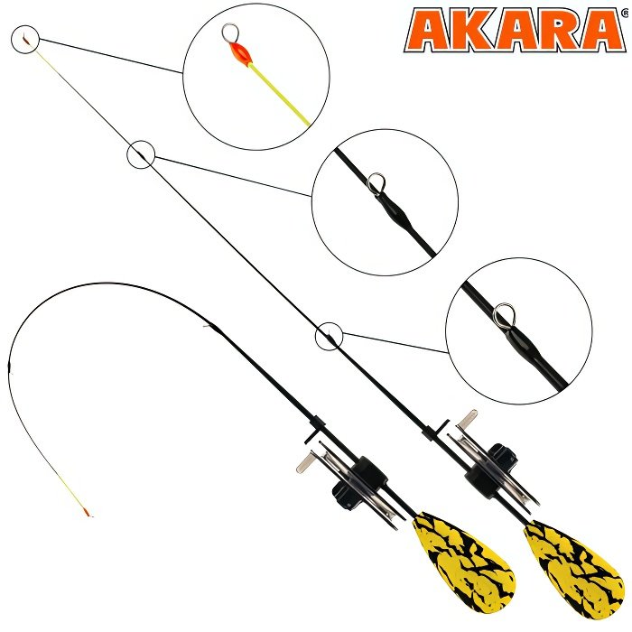 Удочка Akara Finezza Elite Lite YE (1-3,6) - обновленная лайтовая безкивковая зимняя удочка с кольцами на стеклопластиковом хлысте предназначены для ловли на мормышку, чертика или небольшую блесну. Новинка 2025 года от компании Akara Fishing. Преимущество этой безкивковой удочки состоит в том, что ей не нужен кивок, в этом случае сигнализатором поклевки является сам хлыст, шестик выполненный из тончайшего стеклопластика и имеет яркий окрас, что позволяет увидеть любую поклевку, оснащен пропускными кольцами из нержавеющей проволоки. Катушка изготовлена из ударопрочного, морозоустойчивого пластика и имеет винтовой фрикцион для регулировки скольжения, так же для уменьшения веса крепиться на хлыстике, что добавляет чувствительности при поклевке. Рукоять изготовлен из прессованного пенопласта который не морозит руку и имеет минимальный вес, пропускное отверстие под леску имеет увеличенное отверстие для предотвращения замерзания. Подходит для ловли на любую оснастку с тестом до 3,6 грамм. При обзоре характеристик и тестов, зимняя безкивковая удочка Akara Finezza Elite Lite получила положительные отзывы и рейтинги экспертов по рыбной ловли. Выпускается Finezza Elite с тестом 0,7-2,8 и 1-3,6.