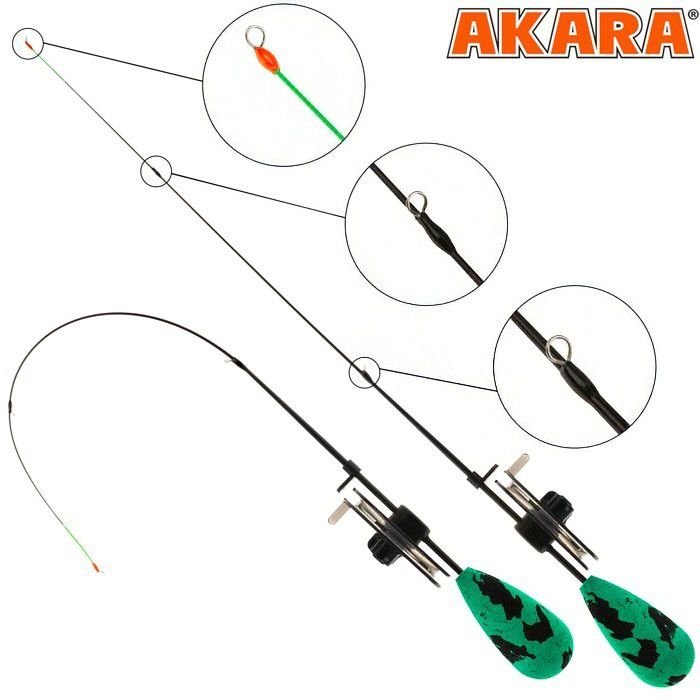 Удочка Akara Finezza Elite UL GN (0,7-2,8) - обновленная ультралайтовая безкивковая зимняя удочка с кольцами на стеклопластиковом хлысте предназначены для ловли на мормышку, чертика или небольшую блесну. Новинка 2025 года от компании Akara Fishing. Преимущество этой безкивковой удочки состоит в том, что ей не нужен кивок, в этом случае сигнализатором поклевки является сам хлыст, шестик выполненный из тончайшего стеклопластика и имеет яркий окрас, что позволяет увидеть любую поклевку, оснащен пропускными кольцами из нержавеющей проволоки. Катушка изготовлена из ударопрочного, морозоустойчивого пластика и имеет винтовой фрикцион для регулировки скольжения, так же для уменьшения веса крепиться на хлыстике, что добавляет чувствительности при поклевке. Рукоять изготовлен из прессованного пенопласта который не морозит руку и имеет минимальный вес, пропускное отверстие под леску имеет увеличенное отверстие для предотвращения замерзания. Подходит для ловли на любую оснастку с тестом до 2,8 грамм. При обзоре характеристик и тестов, зимняя безкивковая удочка Akara Finezza Elite UL получила положительные отзывы и рейтинги экспертов по рыбной ловли. Выпускается Finezza Elite с тестом 0,7-2,8 и 1-3,6.